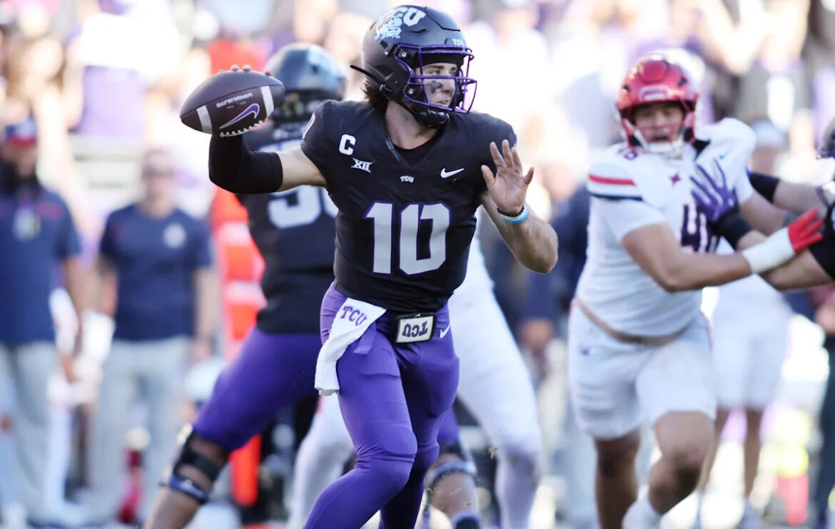 TCU quarterback Josh Hoover (10) throws a pass against Arizona during their game at Amon G. Carter Stadium.