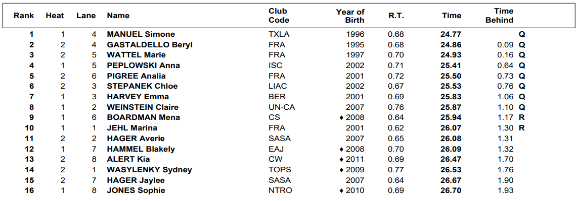 Simone Manuel will turn 30 this year, but she remains firmly among the best sprinters in the United States. In the first semifinal ever contested at a Pro Series, Manuel led the way with a time of 24.77 in the first heat. French swimmers Beryl Gastadello and Marie Wattel followed that up with sub-25 efforts in the second heat, Gastadello going 24.86 and Wattel 24.93. Well back in fourth was Anna Peplowski in 25.41 while the last spot in the heat went to Claire Weinstein (25.87).