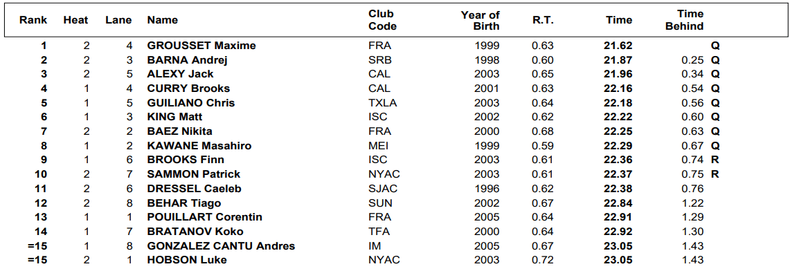 Serbia’s Andrej Barna came in behind Grousset at 21.87 while Jack Alexy, the Worlds bronze medalist in the event last year, took third in 21.96. The field will also include the likes of Brooks Curry (22.16) and Chris Guiliano (22.18) while Tokyo Olympic champion and American-record holder Caeleb Dressel did not advance. He clocked 22.38 for 11th place, a bit slower than the 22.33 he swam in prelims.