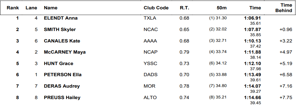 Skyler Smith, who qualified for the U.S. team bound for the Pan Pacific Championships in the 50 breast, placed second in 1:07.87 while Kate Canales was well back in third (1:10.13).