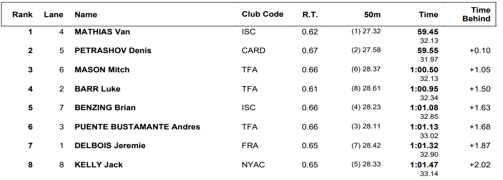 For the first time all night, the race for the win came down to the wire in the men’s 100 breast. Indiana’s Van Mathias, a surprise qualifier for Pan Pacs in the 50 breast, went out in 27.32 and held off Denis Petrashov down the stretch. Mathias clocked 59.45, surpassing his previous best time of 59.74, while Petrashov, a native of Kyrgyzstan who trains at Louisville, was a tenth back in 59.55. Mitch Mason finished third in 1:00.50.