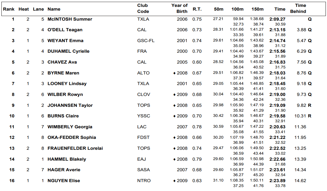 Canadian star Summer McIntosh is competing in her new home pool this week in Austin, and she is by far the class of a 200 IM field missing most of the top U.S. swimmers in the event. McIntosh showed some speed in the early going, swimming within two hundredths of world-record pace after the butterfly leg, but she quickly backed off. Still, McIntosh had the fastest split on each stroke, and she ended up recording a time of 2:09.27. She set the world record last year at 2:05.70.