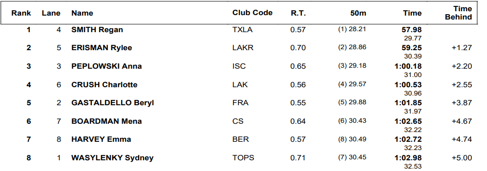 Rylee Erisman, the teenager who blasted her way onto the Pan Pacs team with sizzling sprint freestyle times at the World Junior Championships, came in second at 59.25. That surpassed her previous lifetime best of 59.39. Anna Peplowski came in third in 1:00.18, with Charlotte Crush fourth (1:00.53).