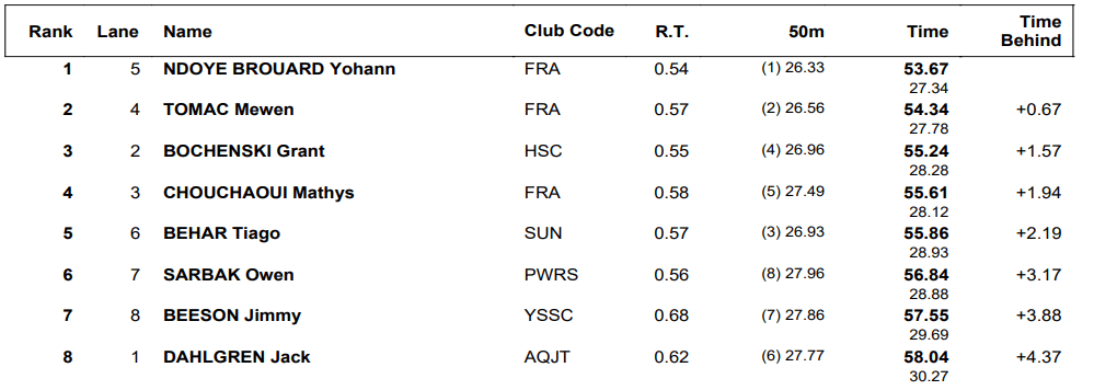 French swimmers claimed the top-two spots in the men’s 100 back, with Yohann Ndoye-Brouard leading the way. Ndoye-Brouard captured bronze medals in both the 100 and 200 back at last year’s World Championships with massive best times. In Austin, Ndoye-Brouard pulled away from countryman Mewen Tomac to take first in 53.67. He swam as fast as 51.92 in the Worlds final. Tomac took second in 54.34, with Grant Bochenski third (55.24).