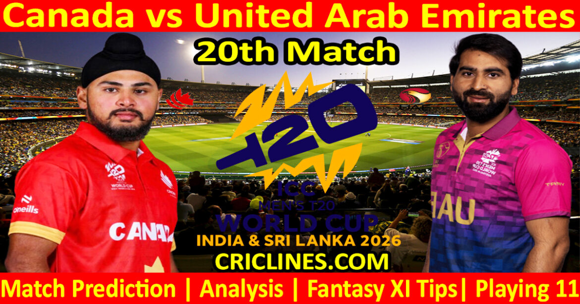 Canada vs United Arab Emirates 20th Match World Cup 2026 Dream11 today match prediction. World Cup T20. Who will win today match CAN vs UAE? We provide 100 % sure today cricket match prediction tips by Raja Babu with Dream11 Fantasy Team Prediction. World Cup toss prediction. Live score with the ball-by-ball update. Cricket toss prediction.