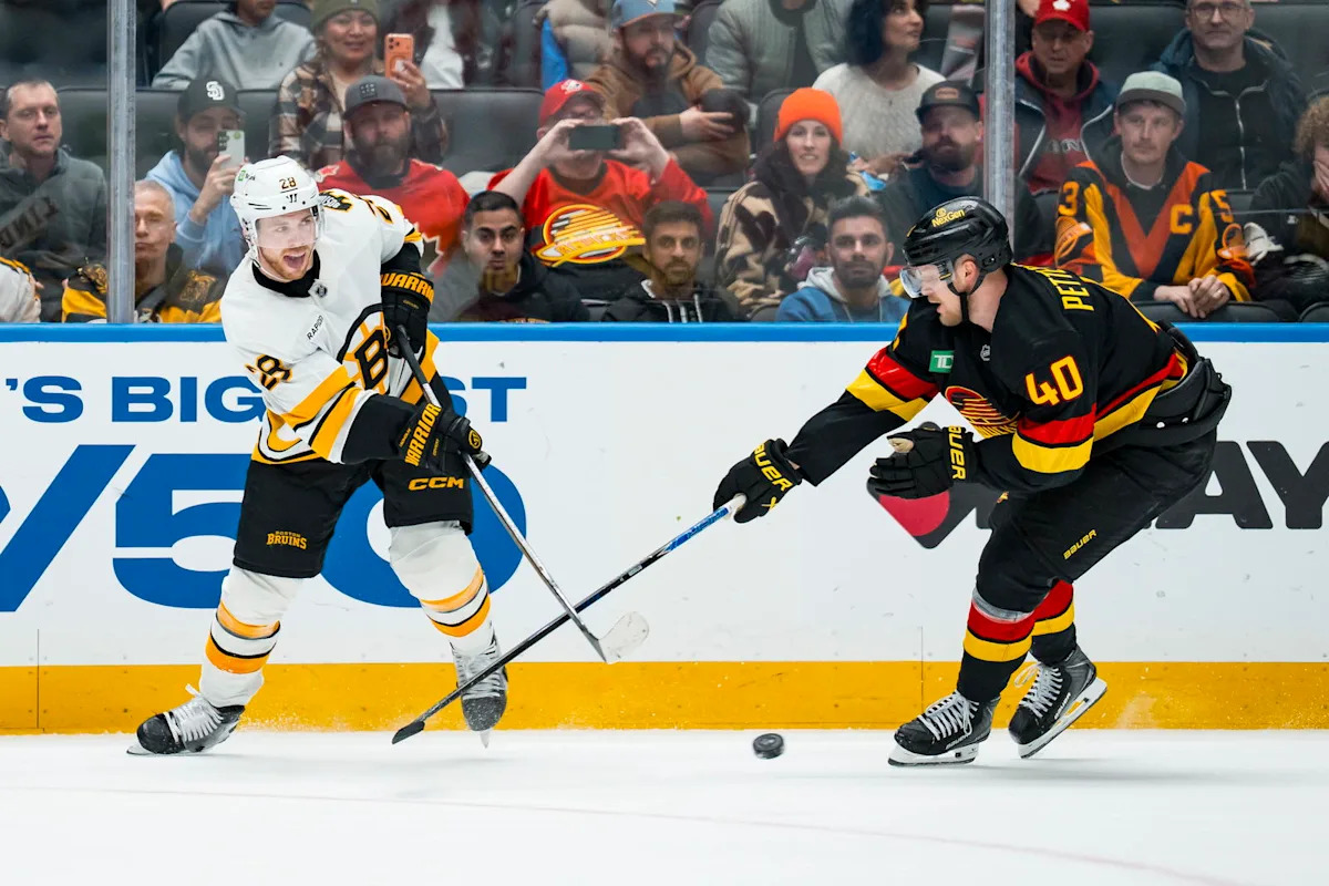 Jan 3, 2026; Vancouver, British Columbia, CAN; Boston Bruins forward Elias Lindholm (28) passes around Vancouver Canucks forward Elias Pettersson (40) in overtime at Rogers Arena. Mandatory Credit: Bob Frid-Imagn Images