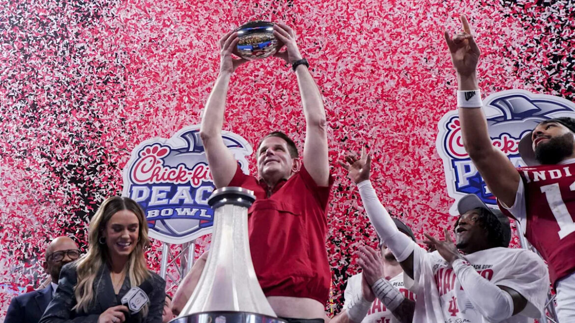 The top-seeded and undefeated Hoosiers continued their march toward the program’s first national championship with a 56-22 rout of No. 5 Oregon at the Peach Bowl Friday night in the second of two national semifinal games. Indiana will face No. 10 Miami in the national title game at Hard Rock Stadium on Jan. 19.