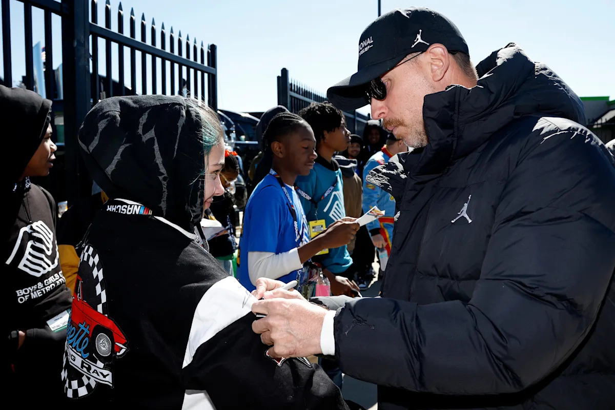 HAMPTON, GEORGIA – FEBRUARY 22: BJ McLeod, driver of the #78 Chevrolet, signs autographs for members of the Boys & Girls Club prior to the NASCAR Cup Series Autotrader 400 at Echo Park Speedway on February 22, 2026 in Hampton, Georgia. (Photo by Sean Gardner/Getty Images)