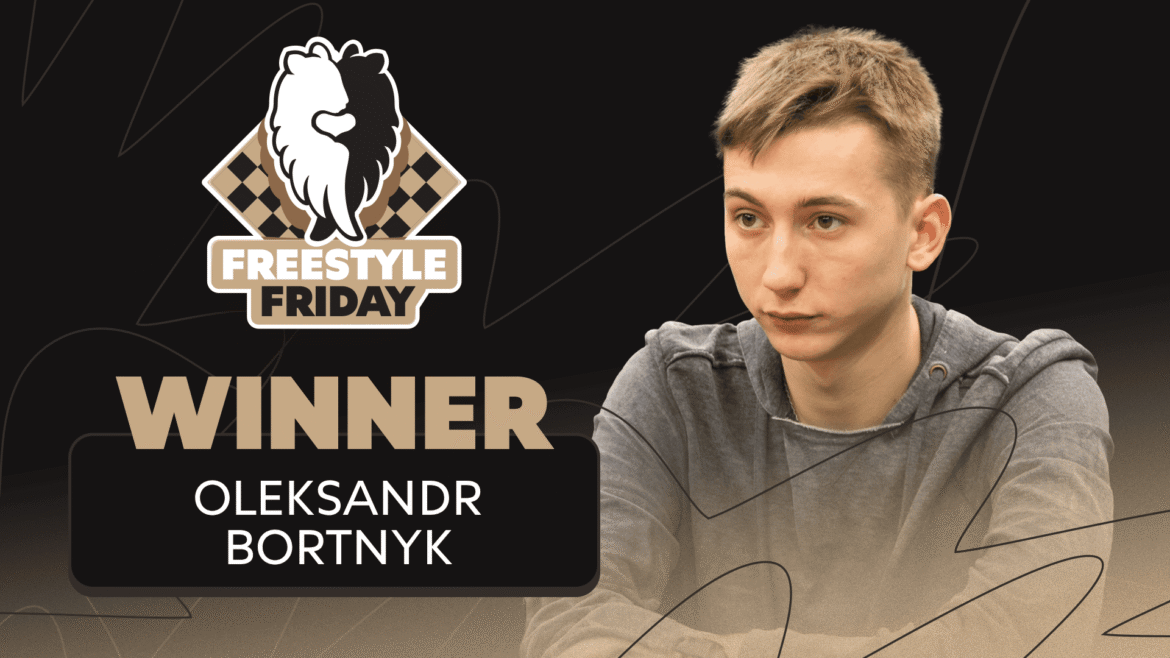 With brand-new stakes introduced by the announcement of the Freestyle Friday Championship, the victory that GM Oleksandr Bortnyk earned in the February 20 edition of Freestyle Friday gave him a jumpstart toward potentially playing in the 2027 FIDE Freestyle Chess World Championship. Bortnyk won the event with a round to spare, earning his seventh Freestyle Friday title, leaving him just one shy of GM Hikaru Nakamura‘s record eight.