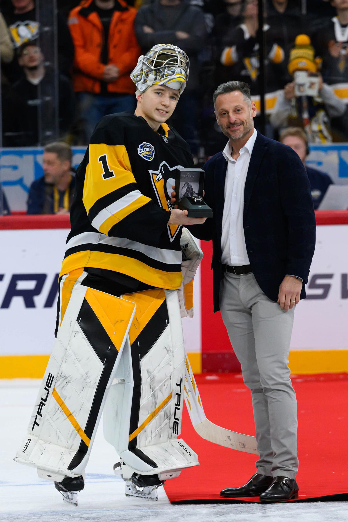 Nov 16, 2025; Stockholm, SWEDEN; Pittsburgh Penguins goaltender Sergei Murashov (1) is presented with a watch after defeating the Nashville Predators in a Global Series ice hockey game at Avicii Arena. Per Haljestam-Imagn Images