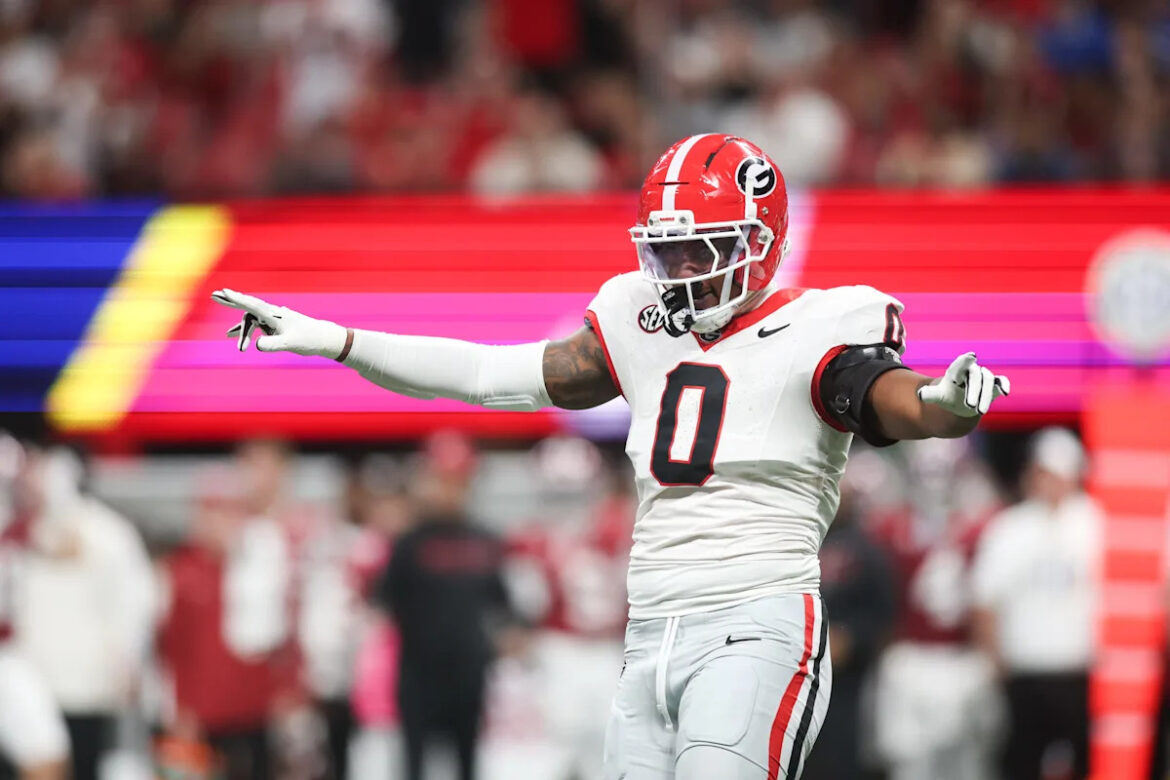 Georgia Bulldogs linebacker Gabe Harris Jr. (0) celebrates a sack during the first quarter against the Alabama Crimson Tide during the 2025 SEC Championship game