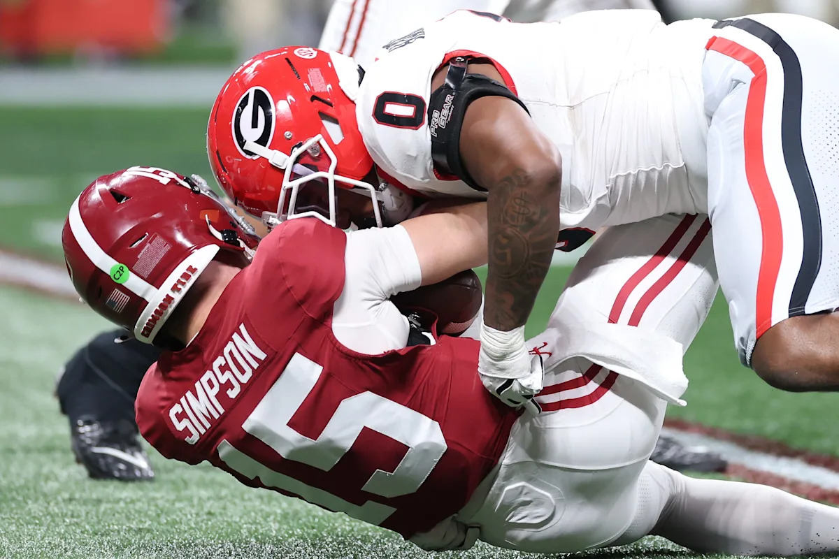 Gabe Harris Jr. #0 of the Georgia Bulldogs sacks Ty Simpson #15 of the Alabama Crimson Tide during the first quarter in the 2025 SEC Championship