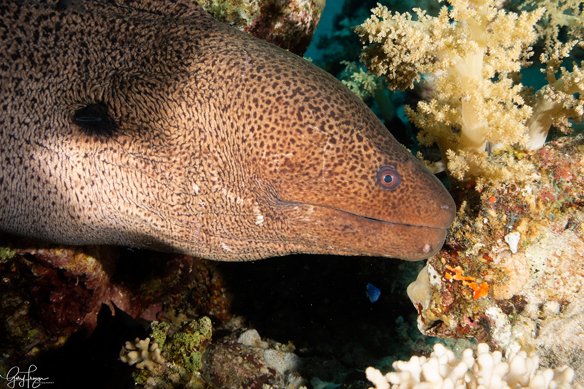 They feed primarily on fish, occasionally on crustaceans and octopus. You may see giant morays rhythmically opening and closing their mouths. They do this to maintain a respiratory current past the gills.