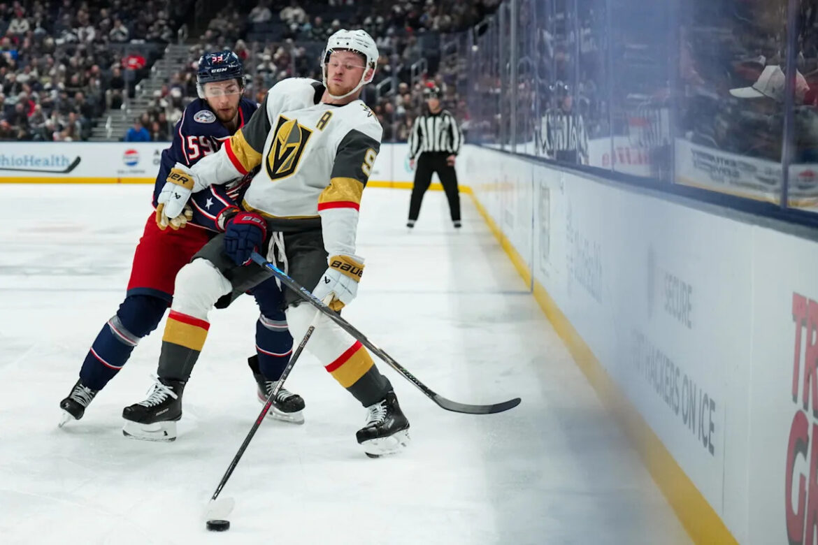 PHOTO CAPTION: Columbus Blue Jackets right wing Yegor Chinakhov (59) skates for the puck against Vegas Golden Knights center Jack Eichel (9) in the third period at Nationwide Arena.