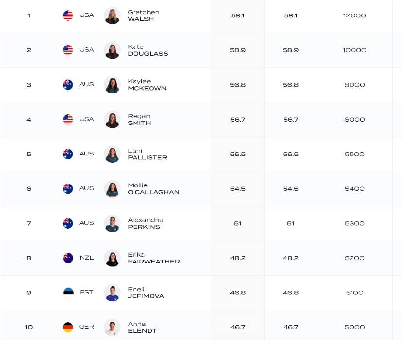 In sweeping the backstroke events, Kos totaled 58.4 points to secure a lead over the Netherlands’ Caspar Corbeau, who scored 55.8 points while winning the 100 breaststroke and 200 breaststroke, along with placing second in the 50 breaststroke. In third sits American Carson Foster (55.4 points), who left Carmel with wins in the 400 freestyle and 400 individual medley. Points are accumulated based on event finishes and times produced.