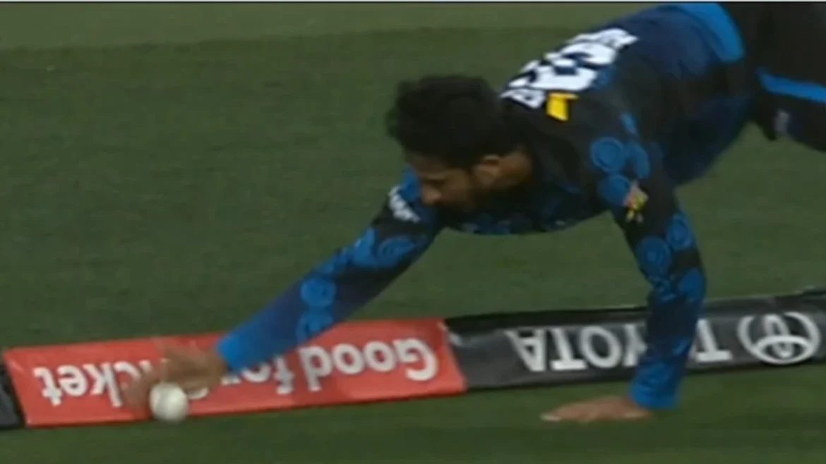 The shot went fast towards the boundary. Hasan was fielding deep at sweeper cover and had a long distance to run. He chased the ball hard and first tried to stop it with his right hand, but he missed it. Realizing the ball was still going towards the boundary, he then dove desperately to pull it back. However, during the dive, the ball touched the boundary cushions.