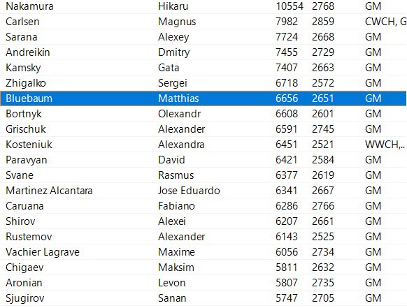 How can this surge in form be explained? One possible factor is that alongside his professional chess career, Matthias Blübaum studied mathematics at Bielefeld University from 2015 onwards, completing his degree successfully in 2022. Now he can focus chess. What is striking, however, is the number of his games listed in the Mega Database. Blübaum is recorded there with around 6,500 games played, placing him among the players with the highest number of games. Only six players have played more games, including Nakamura and Carlsen at the very top. A large proportion of these games are from online tournaments.