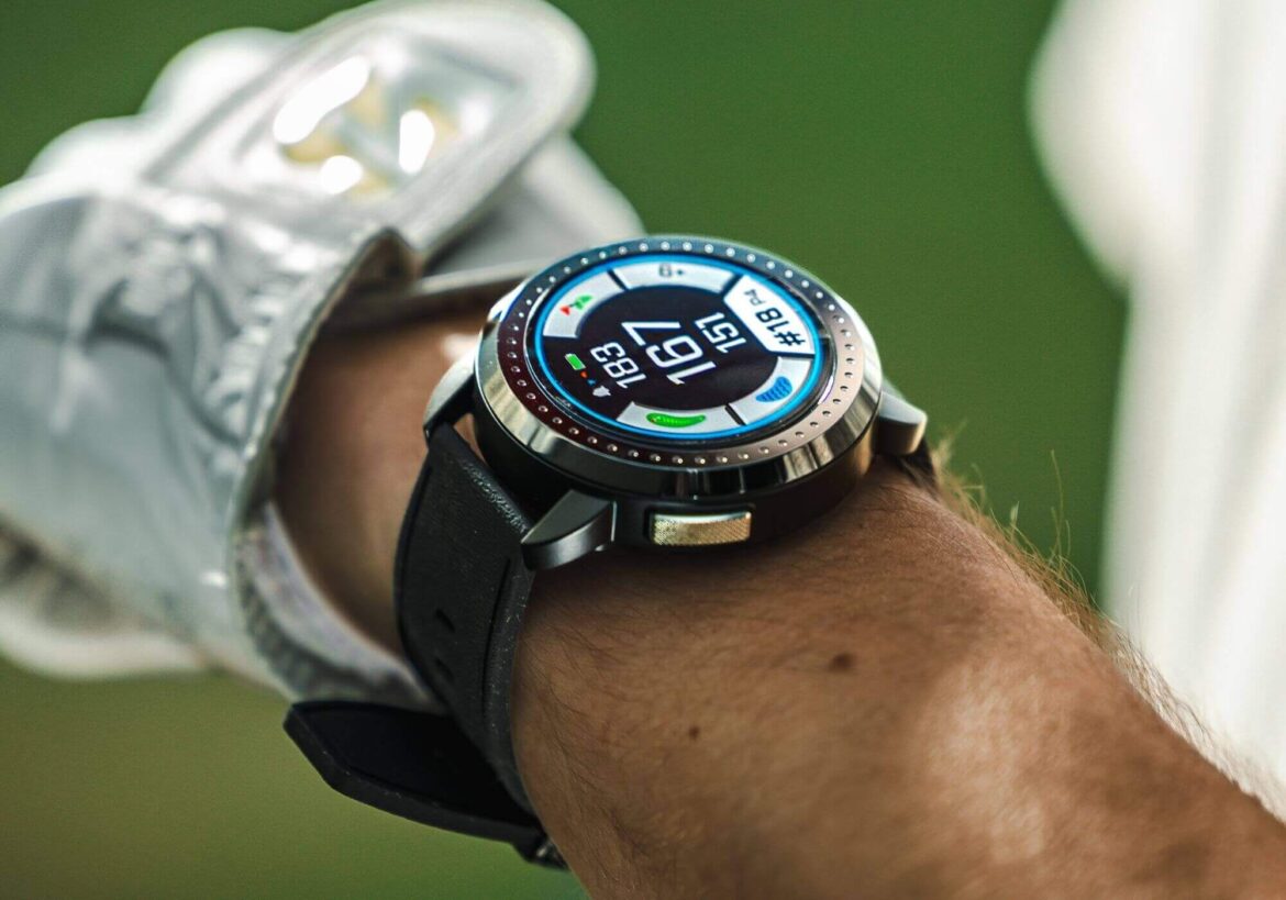 The GolfBuddy Aim W12 earned an impressive 9.7 overall. It uses a 1.32-inch TFT-LCD color touchscreen and offers slope-adjusted yardages, green undulation visuals (on most U.S. courses) and hazard/front-back distances. The watch is IPX7 water resistant, preloaded with 40,000 courses and runs about 10 hours in golf mode.