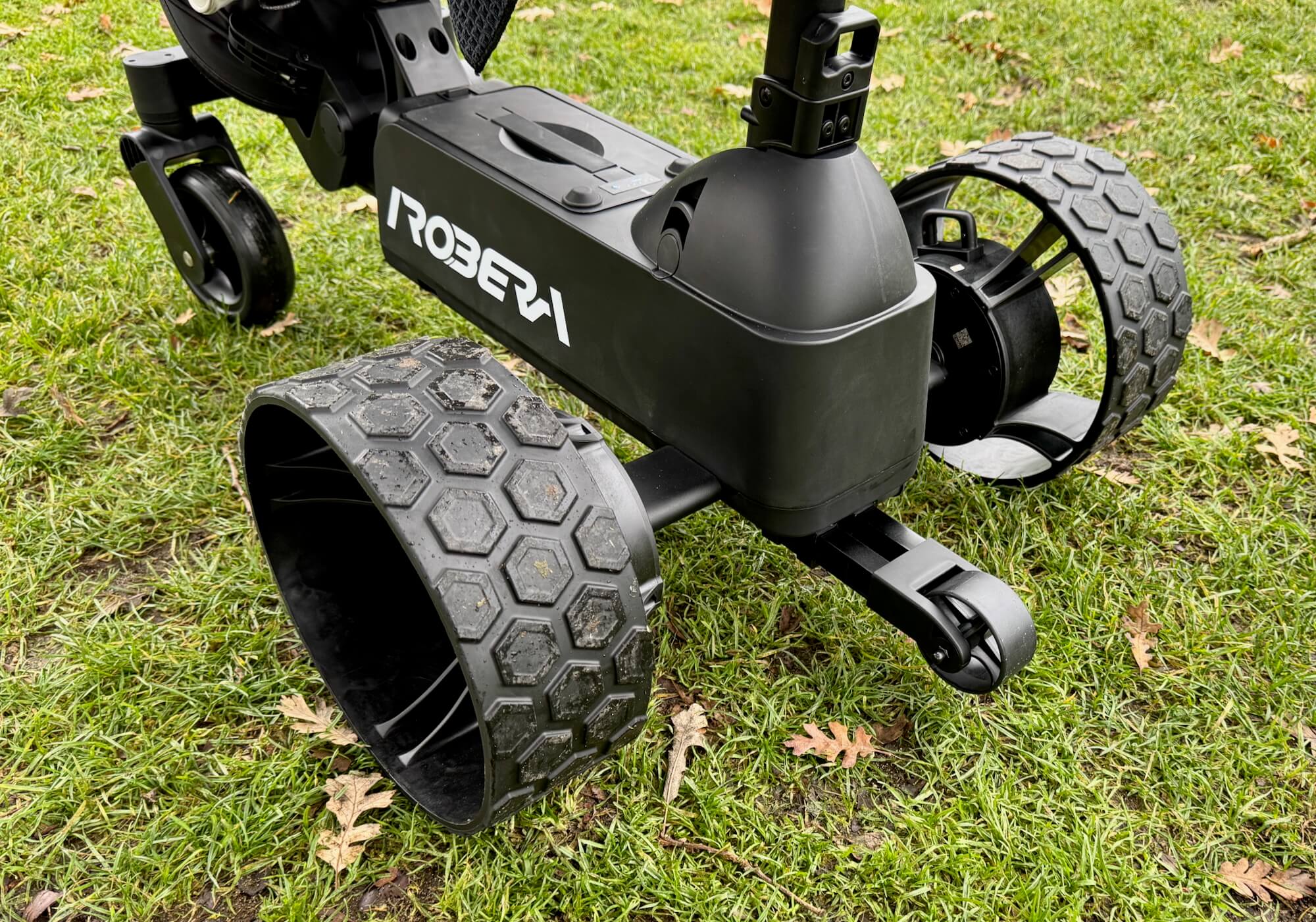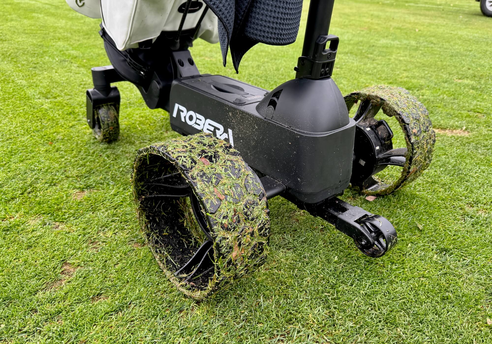 During early testing, I did tip it forward by having it follow me down a short, but steep, tee box slope. On steep climbs, especially in wet grass, the Robera Pro would lose traction and spin its wheels.