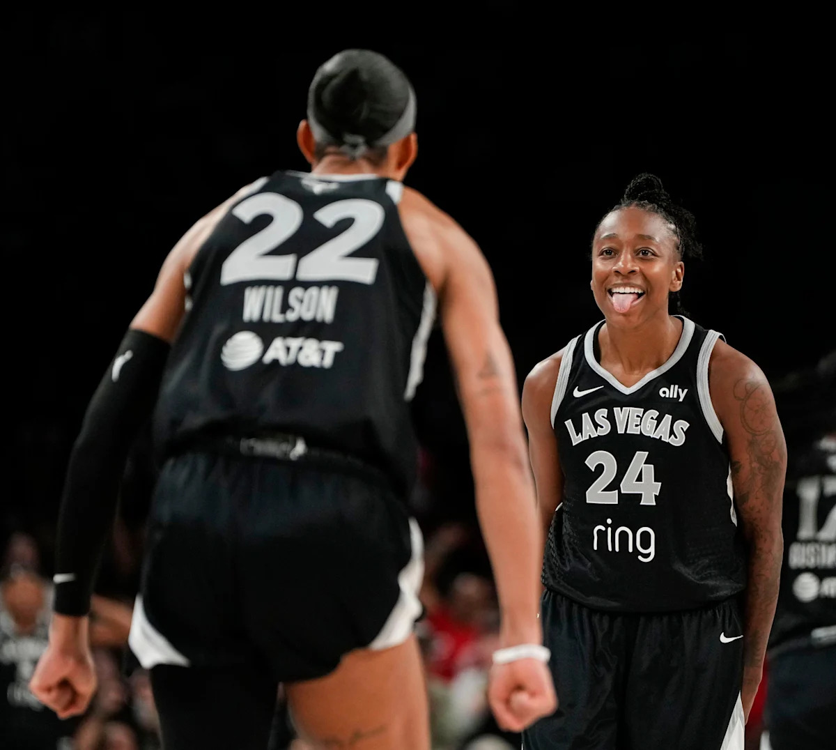 Game 2: The Las Vegas Aces’ Jewell Loyd (24) and A’ja Wilson (22) celebrate after scoring against the Phoenix Mercury.