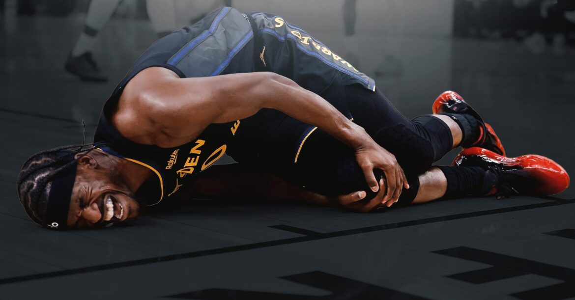 His right knee twisted awkwardly on the landing, sending him crashing to the floor in visible pain. He stayed down for several minutes as teammates gathered around him in silence at Chase Center before he was helped off the court and into the locker room.