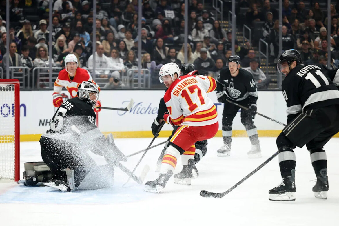 After the obvious kicking motion, Calgary centre Morgan Frost scored the game-winning goal just a few seconds later as the Flames edged the Kings 2-1, extending Los Angeles’ struggles to win at home 4-6-4 and close out games despite strong goaltending from Darcy Kuemper today and another early lead.