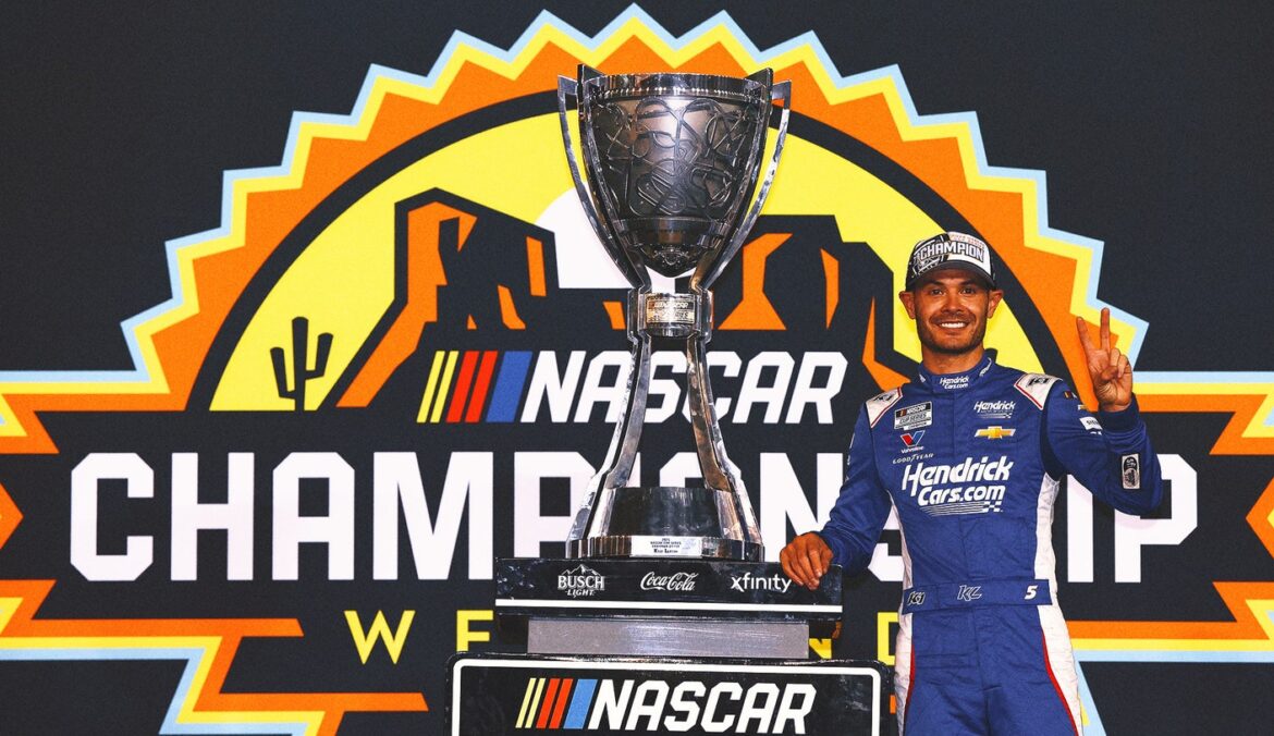 Kyle Larson celebrates in victory lane after winning the NASCAR Cup Series Championship at Phoenix.