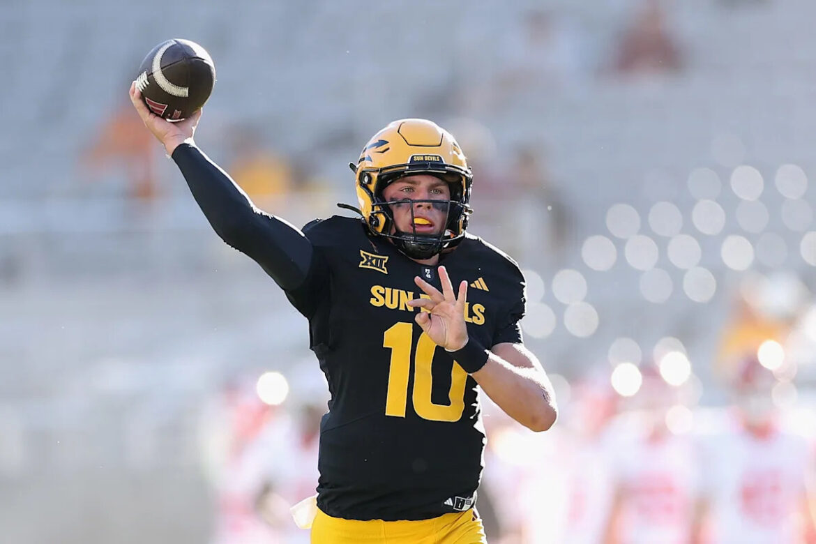 TEMPE, ARIZONA – OCTOBER 25: Sam Leavitt #10 of the Arizona State Sun Devils warms up before the NCAAF game at Mountain America Stadium on October 25, 2025 in Tempe, Arizona. The Cougars defeated the Sun Devils 24-16. (Photo by Christian Petersen/Getty Images)