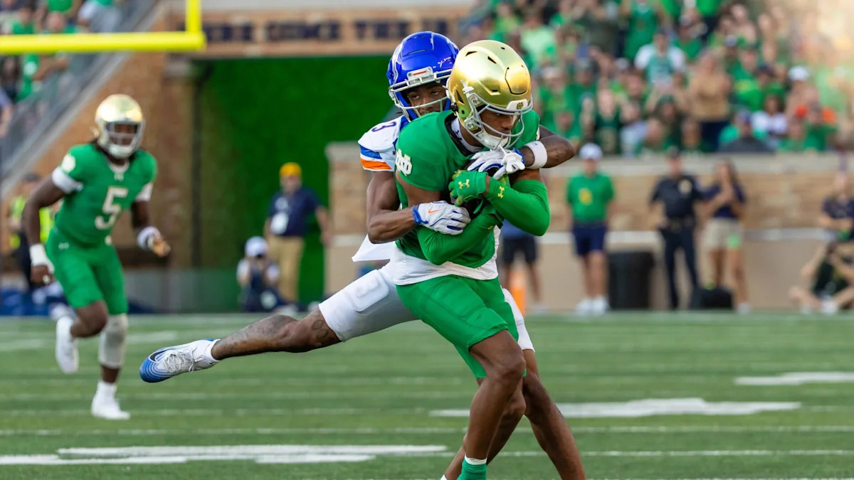 Notre Dame star running back Jeremiyah Love briefly left the game in the first half, but returned and finished with 103 yards rushing and a 4-yard TD run. Jadarian Price rushed for 83 yards and scored on a 49-yard run.