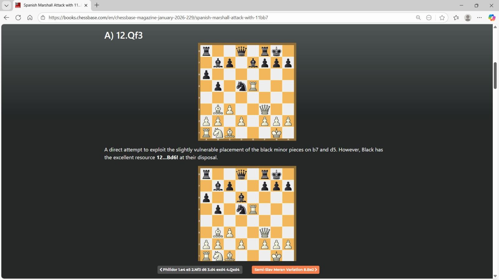 “In my opinion 11…Bb7!? has replaced 11…c6 as the absolute main line of the Marshall Attack. Both moves are equally good objectively speaking, but developing the bishop comes more naturally. … An excellent practical weapon for Black!”