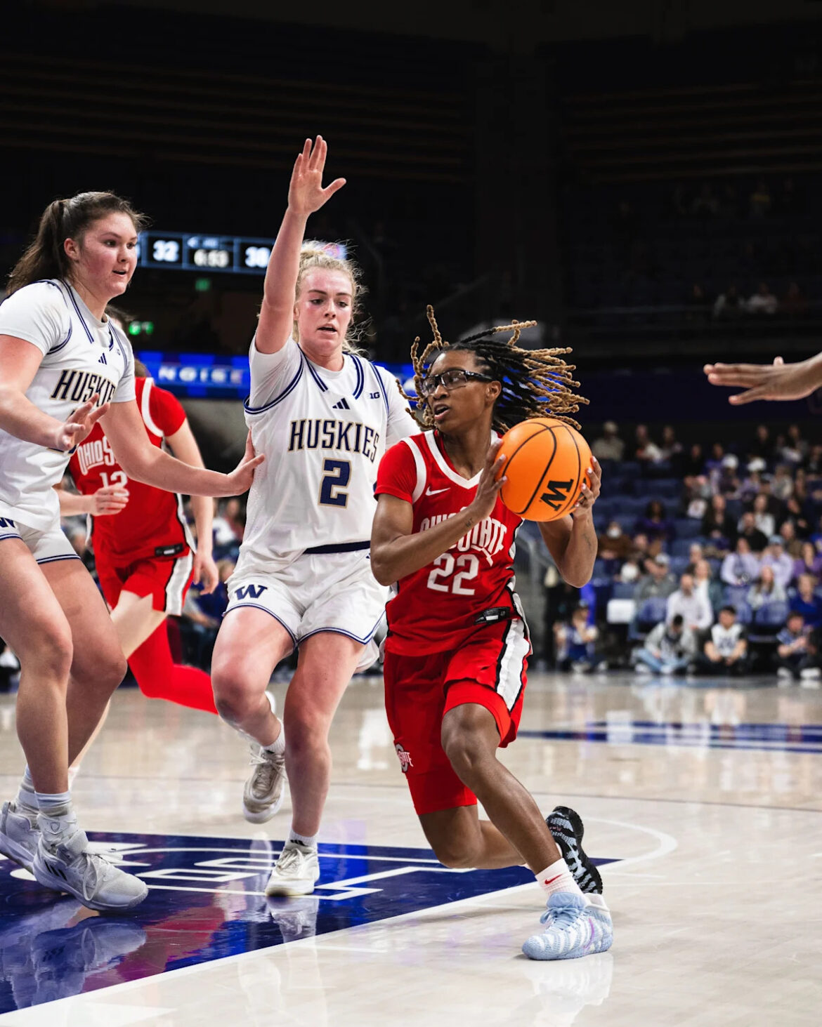 Washington got to within three points before Ohio State began hitting shots again with a 3-for-5 ending to the quarter for the visiting Buckeyes. The last moments of the half represented the defensive focus of the game to that point. Center Elsa Lemmilä had four first half blocks and had one that put Ohio State on the fast break. Washington guard Sayvia Sellers stole the ball from guard Ava Watson in the paint and it suddenly turned into a Huskies fast break, and the fun was not over. Ohio State guard Kennedy Cambridge then grabbed the ball from behind to keep both sides off the board in the closing moments.