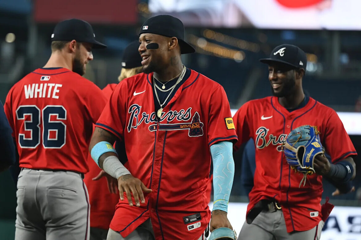WASHINGTON, DC – SEPTEMBER 17: Ronald Acuña Jr. #13 of the Atlanta Braves celebrates with teammates after winning the game between the Atlanta Braves and the Washington Nationals at Nationals Park on Wednesday, September 17, 2025 in Washington, District of Columbia. (Photo by Alyssa McDaniel/MLB Photos via Getty Images) | MLB Photos via Getty Images