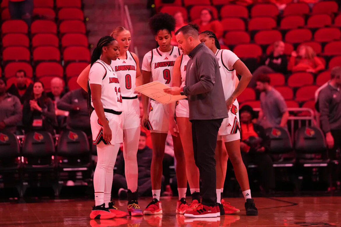 LOUISVILLE, KENTUCKY – DECEMBER 10: Head coach Jeff Walz of the Louisville Cardinals meets with his team before the game against the Ball State Cardinals at the KFC YUM! Center on December 10, 2025 in Louisville, Kentucky. (Photo by Dylan Buell/Getty Images) | Getty Images