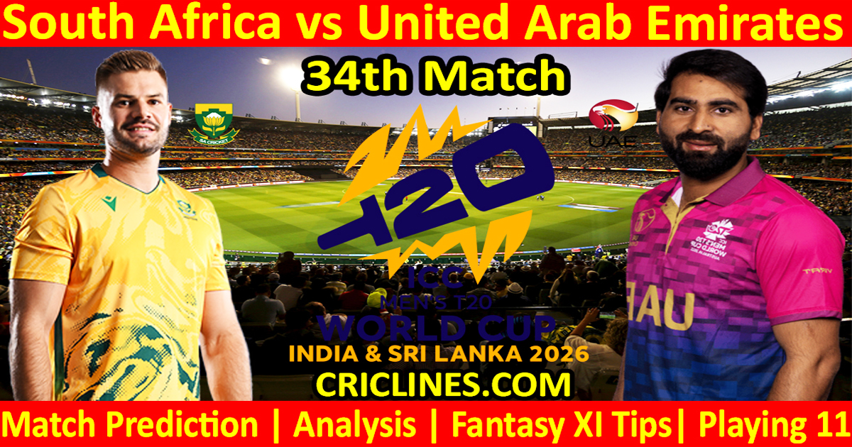 South Africa vs United Arab Emirates 34th Match World Cup 2026 Dream11 today match prediction. World Cup T20. Who will win today match SA vs UAE? We provide 100 % sure today cricket match prediction tips by Raja Babu with Dream11 Fantasy Team Prediction. World Cup toss prediction. Live score with the ball-by-ball update. Cricket toss prediction.