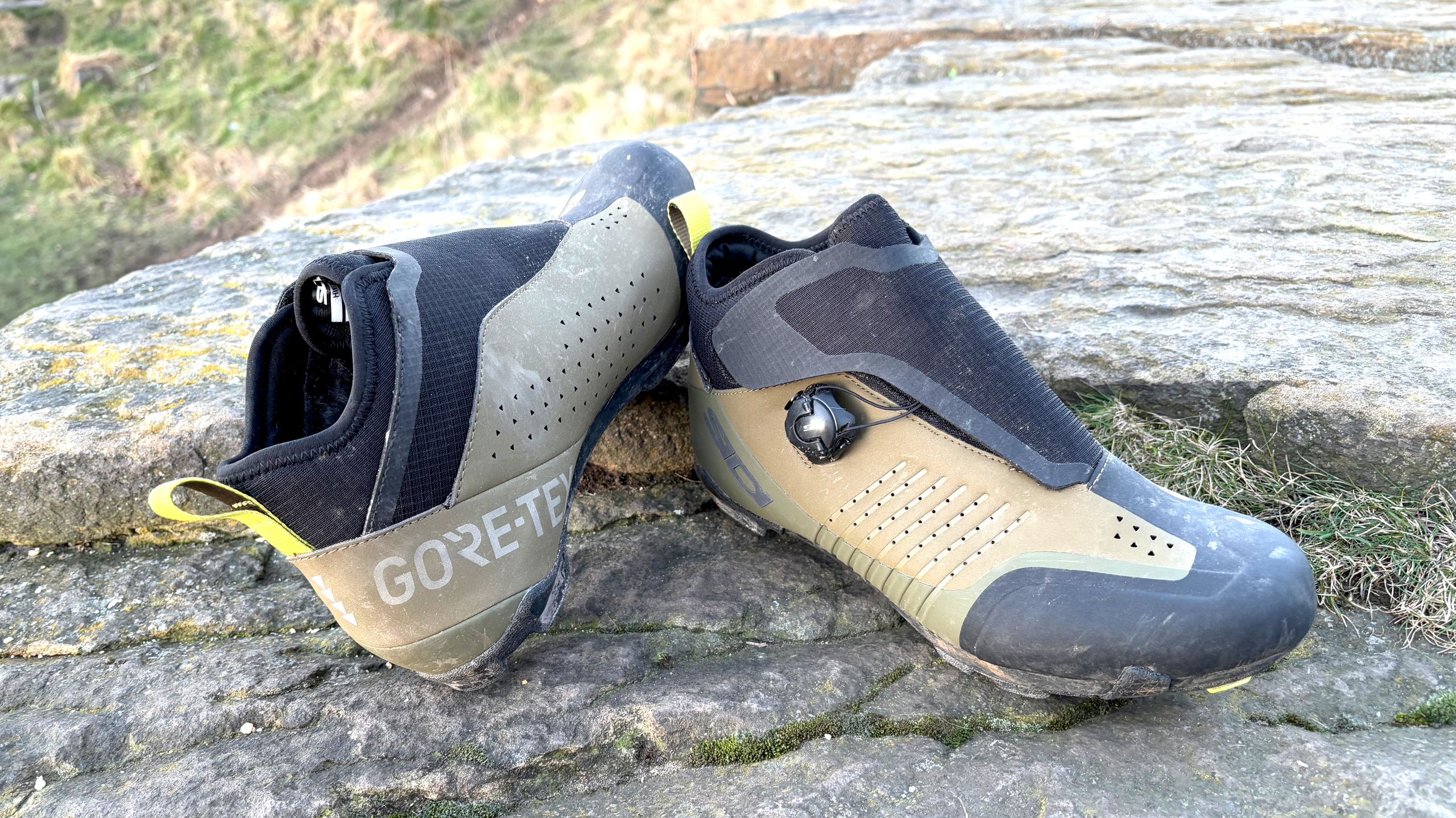 The first thing you notice is the styling; it’s far from the usual Sidi formula and features a mix of subtle, earthy green tones and a very modern-looking matte finish. They are ankle-high boots and feature a flap covering the tongue and retention system section, made from robust rip-stop material, which is joined to an ankle cover. All of this is designed to keep mud and water out of the shoe. I had the black and green olive colourway on test, though they come in three other colour options.