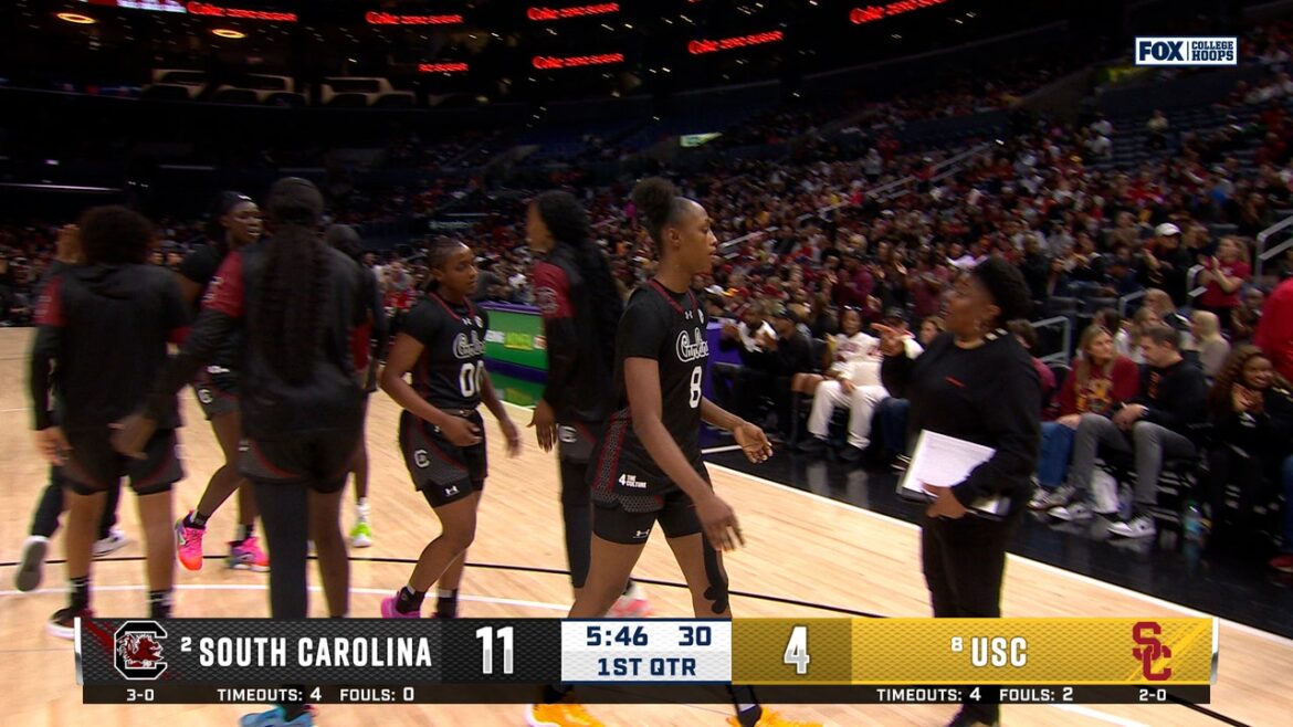 South Carolina Gamecocks’ Joyce Edwards spun around a USC Trojans defender to finish the layup.