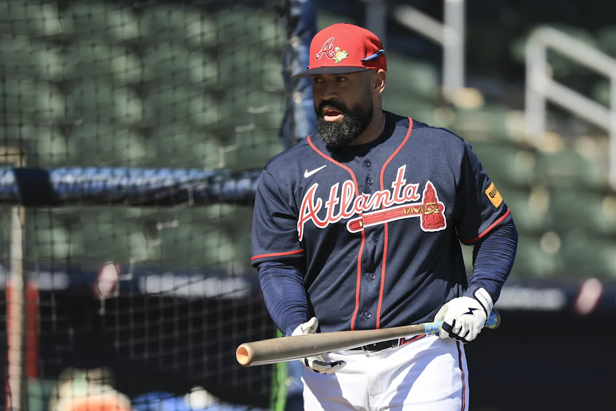 Feb 10, 2026; North Port, FL, USA; Atlanta Braves catcher Sandy Leon takes batting practices during spring training workouts. Mandatory Credit: Kim Klement Neitzel-Imagn Images | Kim Klement Neitzel-Imagn Images