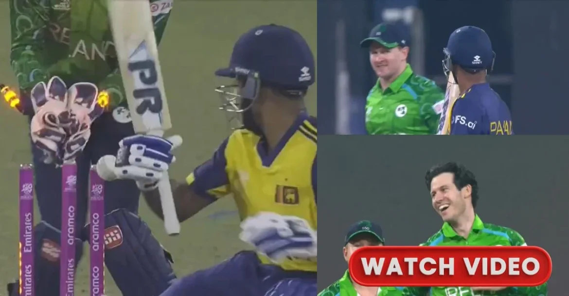 The defining moment of Rathnayake’s short-lived stay occurred on the first ball of the 11th over (10.1). Facing Irish left-arm spinner George Dockrell with Sri Lanka struggling to accelerate at 68/2, Rathnayake attempted an audacious ramp shot against a delivery that demanded a much straighter bat. Getting down on one knee too early, he looked to guide the ball toward third man, but his lack of footwork and poor execution were exposed as the ball stayed low and skidded through.