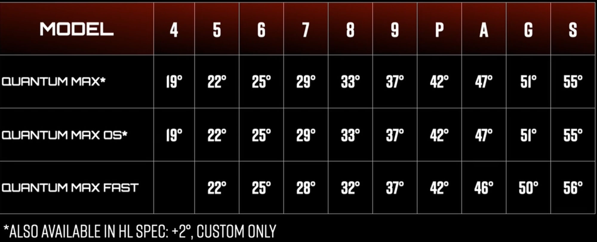 The Callaway Quantum Max and Max OS irons are available in a 4-iron through a set with matching sand wedge. The Max Fast is available in a 5-iron through sand wedge.