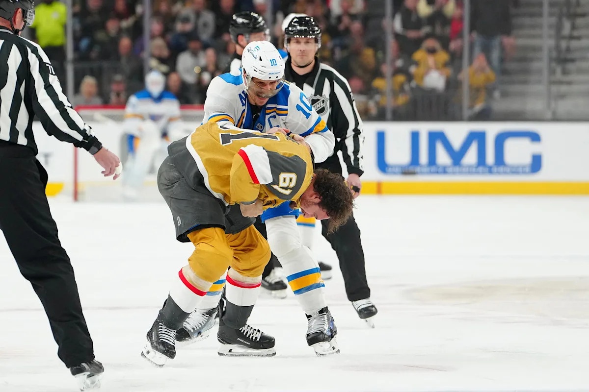 St. Louis Blues captain Brayden Schenn fights Vegas Golden Knights captain Mark Stone (Stephen R. Sylvanie-Imagn Images)
