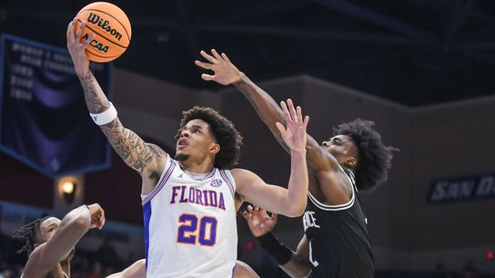 Florida guard Xaivian Lee (1) releases a jumper shot during an NCAA basketball game against Providence`, Friday November 28, 2025 in San Diego, California.