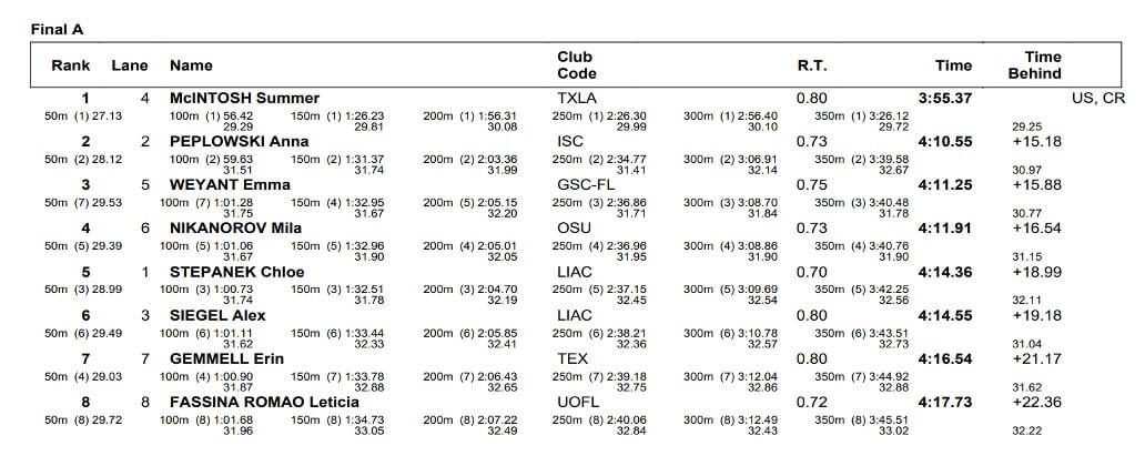 There wasn’t any doubt about the outcome of the 400 freestyle at the Jamail Swim Center. The only question was the margin of victory for Summer McIntosh, and how far under the four-minute barrier she could get. Ultimately, the world-record holder in the event prevailed by 15 seconds, picking up the win in 3:55.37, which was good for the second-fastest time in history. Only McIntosh, with a 3:54.18, has been faster.