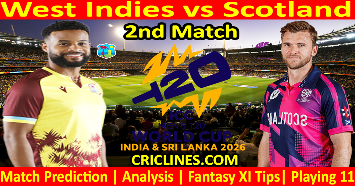 West Indies vs Scotland 2nd Match World Cup 2026 Dream11 today match prediction. World Cup T20. Who will win today match WI vs SCO? We provide 100 % sure today cricket match prediction tips by raja babu with Dream11 Fantasy Team Prediction. World Cup toss prediction. Live score with the ball-by-ball update. Cricket toss prediction.